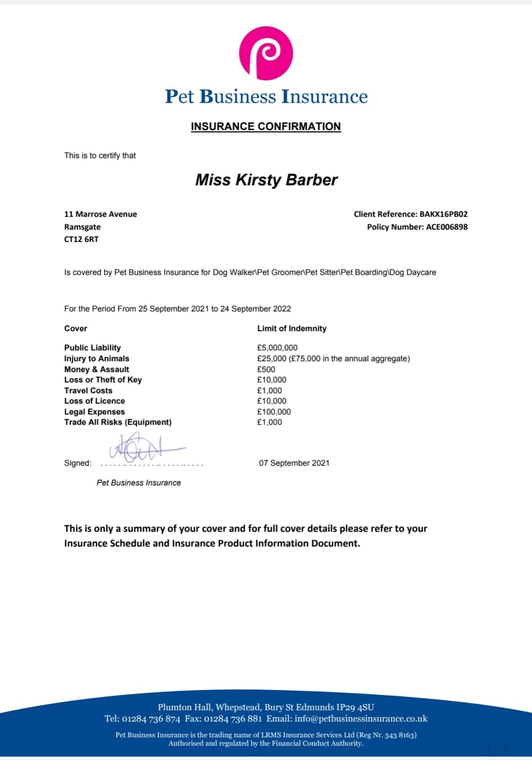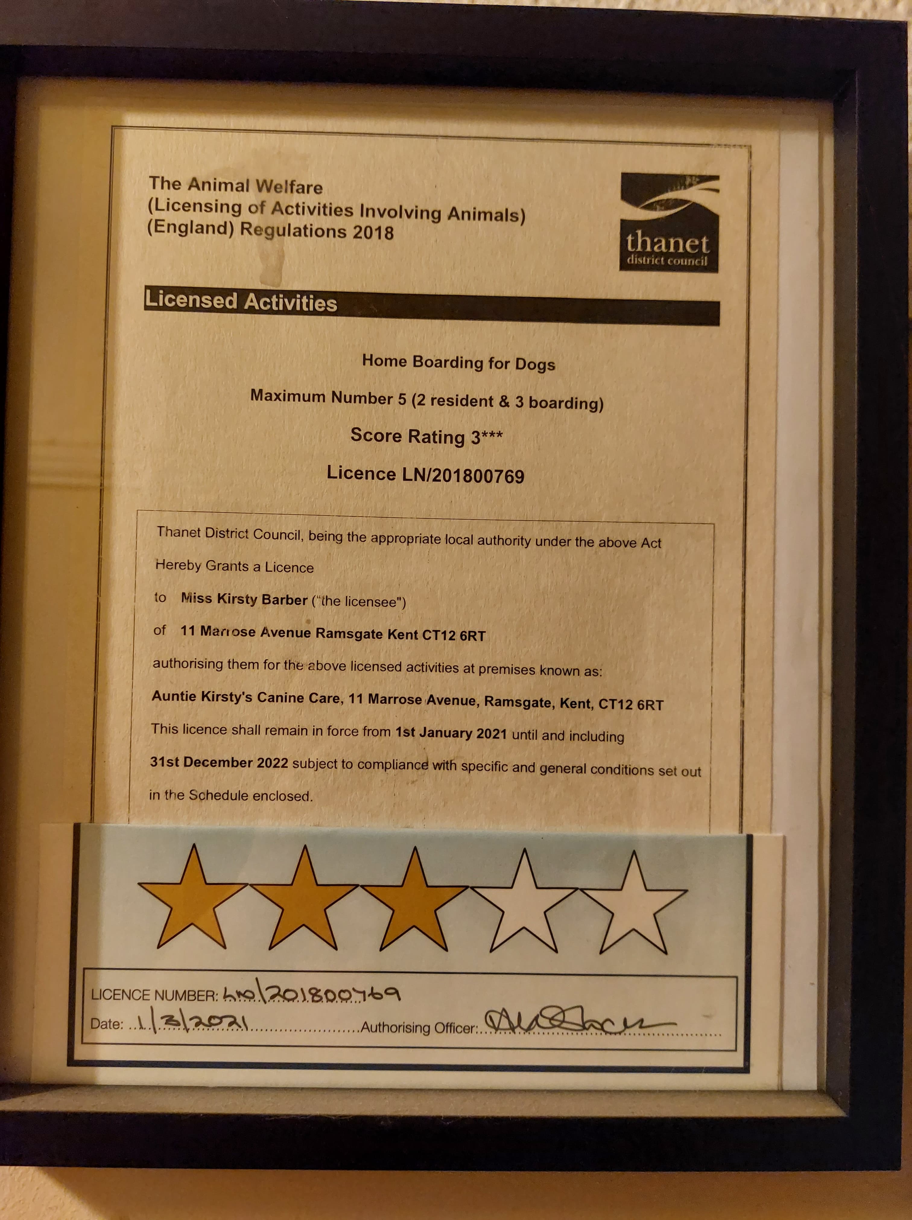 We are licensed by Thanet District Council (no: LN/201800769), approved by Eagle Vets, insured by Pet Business Insurance, and canine first aid trained by Animal Aiders.